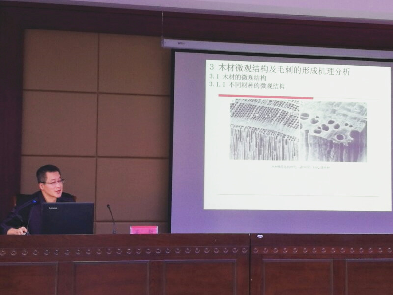 在两个小时的学术报告会中,吴哲副教授围绕“木材微观结构及毛刺的形成机理分析”、“纳秒脉冲激光与木材作用的烧蚀机理”、“脉冲激光烧蚀毛刺的仿真模拟”、“脉冲激光烧蚀设备的设计构想”以及“实验设备和实验材料”五大方面介绍了激光技术在现代林业生产制造中的应用情况。