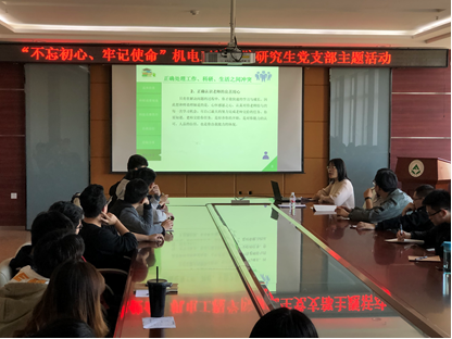 获得2019年研究生国家奖学金并考取哈尔滨工业大学博士的机械类党支部党员缪骞同学首先进行了经验分享。她简要介绍了研究生阶段取得的科研成果,结合自身分析了如何正确处理工作、科研、生活之间冲突,合理分配时间精力。她谈到,“读书为了成才,国家培养我们,是为了我们长大之后成才报国,因此我们来到这里的目的就是学习文化知识,学习做人的道理,学习与人相处之道。工作和科研以及生活是不能混为一谈,作为研究生要做的不是抱怨,而是去完成工作,调整自己,适应环境。琐碎瞬间组成的人生远比单一的生活更加有趣和多彩。读研期间做过的每一件事、面临的每一次挑战、每一次面对老师的教诲,都是一种人生宝贵财富。拿出本子,记录每天的任务,你会发现自己真的很强大。”