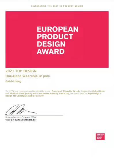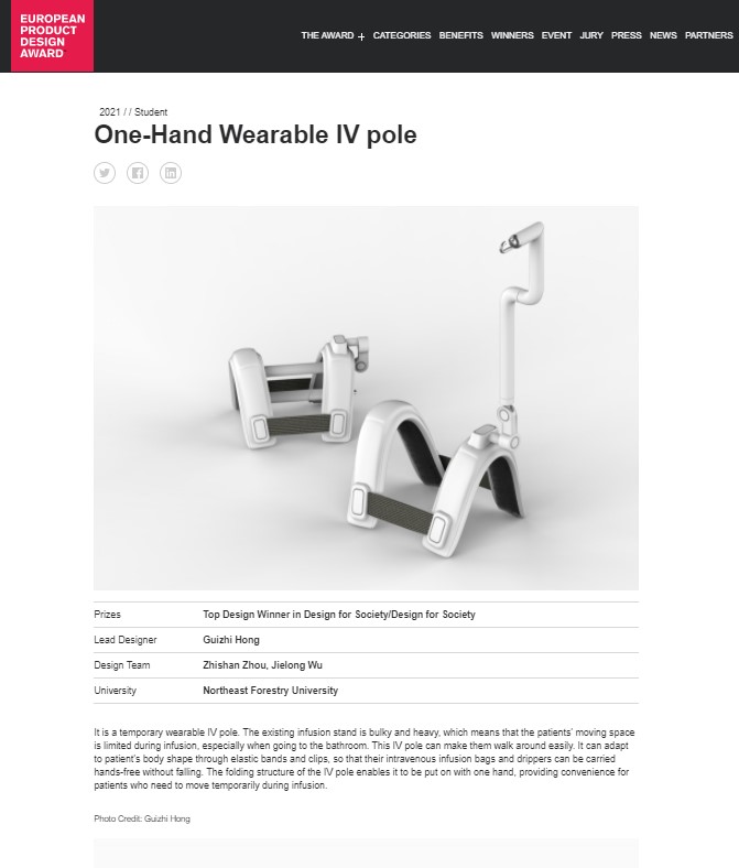 日前,2021年度欧洲产品设计奖(European Product Design Award™)新鲜出炉,由我院工业设计专业2018级本科生洪贵芝、周稚珊团队设计的“One-Hand Wearable IV pole(单手可穿戴输液架)”荣获员工类作品“最佳设计奖”暨铂金奖(TOP DESIGN WINNER)。东北赛区铂金奖共2项,其中黑龙江1项(4118云顶集团)。