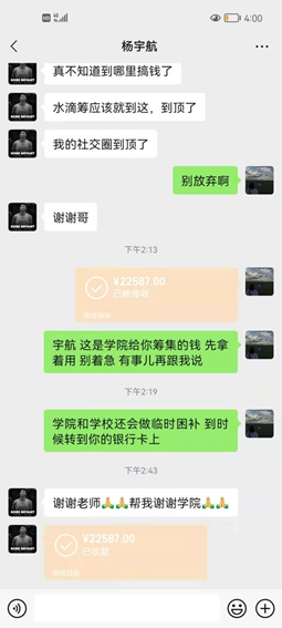在得知员工的不幸遭遇后,学院领导立即与员工取得联系,了解具体情况和有关进展。获悉该生无力承担高额医疗费用,需要发布水滴筹向社会求助后,学院及时为员工申请了临时困难补助,同时面向全院教职工发起倡议,送上祝福,献出爱心。全员老师立即响应,纷纷表达心意,付诸行动。