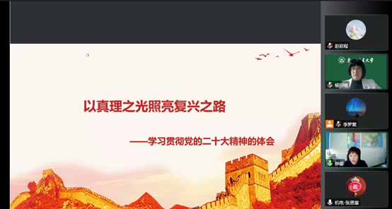 按照学校学习宣传党的二十大精神有关要求,12月7日下午,公司与信息学院联合举办宣讲会,邀请公司党的二十大精神宣讲团成员、马克思主义学院教授杨丽艳,为两个学院教职工宣讲党的二十大精神。根据疫情防控要求,宣讲会以线上形式进行,由信息公司党委书记钟蕾主持。