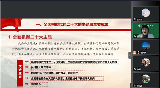 宣讲会上,杨丽艳教授以《以真理之光照亮复兴之路》为主题,阐释了“学习宣讲党的二十大精神是当前和今后一个时期全党全国的首要政治任务”,事关党和国家事业继往开来、事关中国特色社会主义前途命运、事关中华民族伟大复兴。围绕“全面把握党的二十大的主题和主要成果”,“全面领会党的二十大提出的新思想新论断、作出的新部署新要求”和“全面落实党的二十大精神,做好教书育人工作”三个方面,深入浅出地开展宣讲。杨丽艳教授系统地讲解了党的二十大主题,即“高举中国特色社会主义伟大旗帜,全面贯彻习近平新时代中国特色社会主义思想,弘扬伟大建党精神,自信自强、守正创新,踔厉奋发、勇毅前行,为全面建设社会主义现代化国家、全面推进中华民族伟大复兴而团结奋斗”,富含的五大层次内容。带领大家深刻领会,近五年来党和国家事业取得举世瞩目的重大成就、新时代十年伟大变革及其重要意义、开辟马克思主义中国化时代化新境界、中国式现代化的中国特色和本质要求、党的全面领导和全面从严治党的重大部署,深刻把握我国经济社会发展面临的国内国际矛盾风险挑战的重要性。最后,杨丽艳教授结合实际,讲解了如何全面落实党的二十大精神,做好教书育人工作。